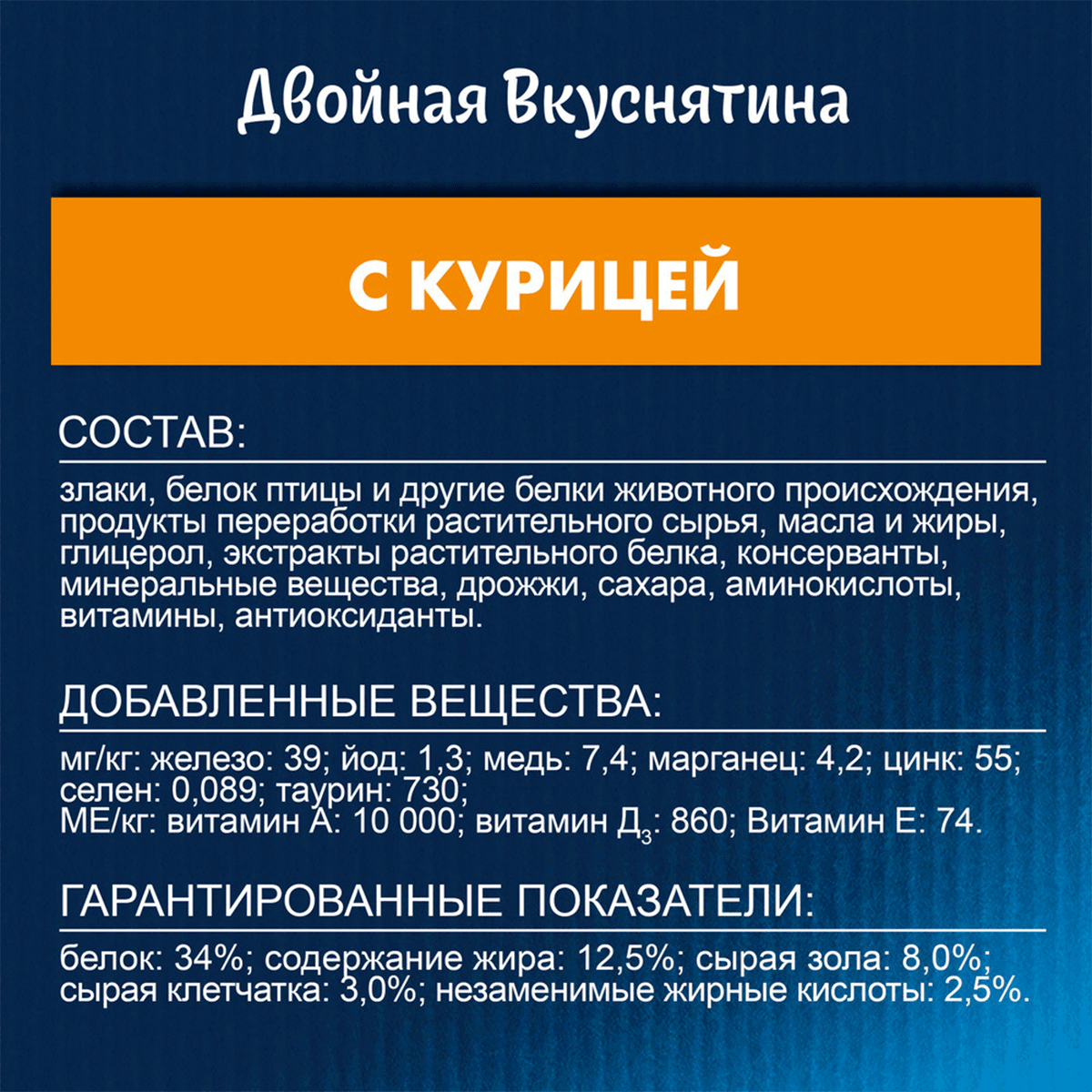 МЕ/кг : Витамин А : 10 000; Витамин Д3 : 860; Витамин Е : 74.