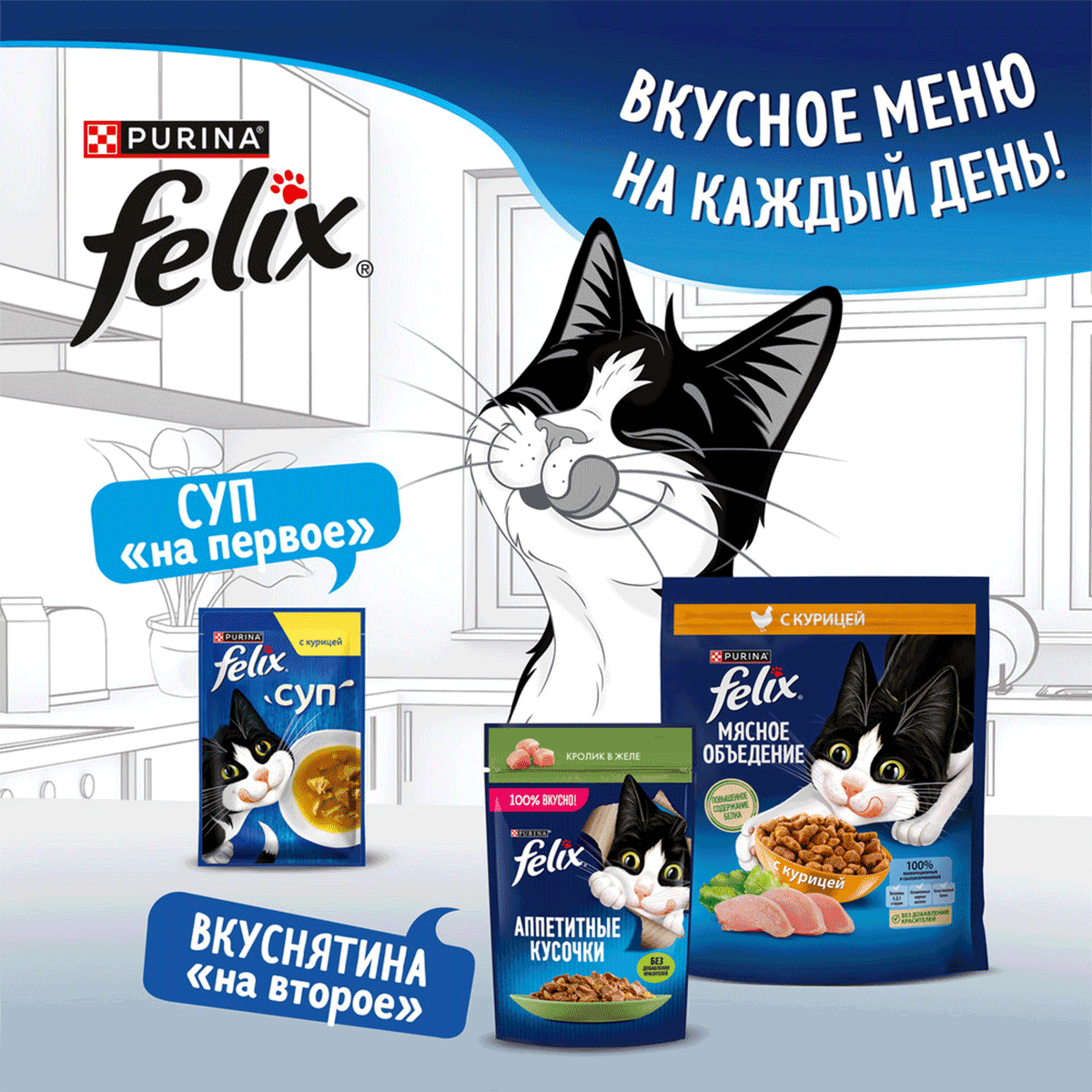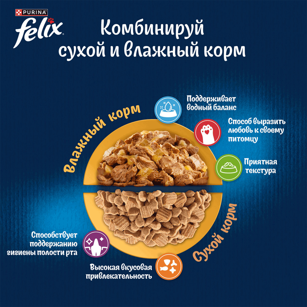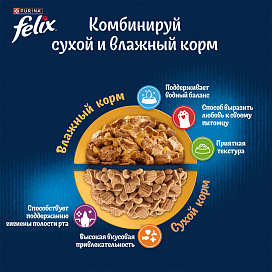Совет от Felix®: Вы пробовали комбинировать сухой и влажный корм в ежедневном рационе Вашего кота? Попробуйте! Ведь теперь Felix® доступен в обоих рационах.