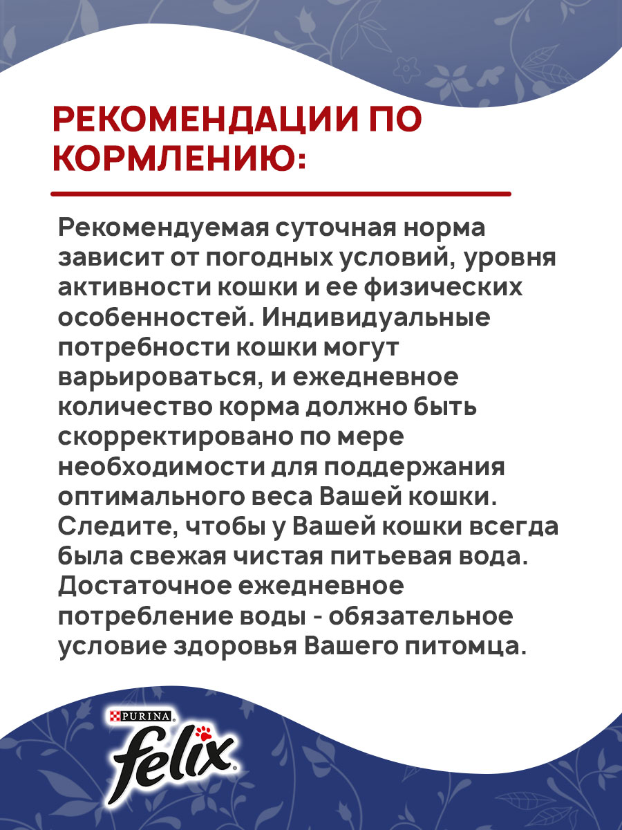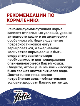 Рекомендации по кормлению: рекомендуемая суточная норма зависит от погодных условий, уровня активности кошки и ее физических особенностей. Индивидуальные потребности кошки могут варьироваться, и ежедневное количество корма должно быть скорректировано по мере необходимости для поддержания оптимального веса Вашей кошки. Следите, чтобы у Вашей кошки всегда была свежая чистая питьевая вода. Достаточное ежедневное потребление воды - обязательное условие здоровья Вашего питомца.