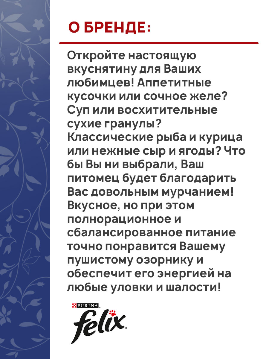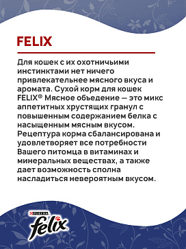 Для кошек с их охотничьими инстинктами нет ничего привлекательнее мясного вкуса и аромата. Сухой корм для кошек FELIX® Мясное объедение — это микс аппетитных хрустящих гранул с повышенным содержанием белка с насыщенным мясным вкусом. Рецептура корма сбалансирована и удовлетворяет все потребности Вашего питомца в витаминах и минеральных веществах, а также дает возможность сполна насладиться невероятным вкусом.