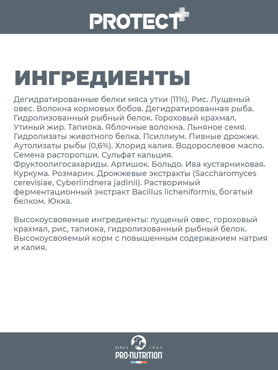 Дегидратированные белки мяса утки (11 %), рис, лущеный овес, волокна кормовых бобов, дегидратированная рыба, гидролизованный рыбный белок, гороховый крахмал, утиный жир, тапиока, яблочные волокна, льняное семя, гидролизаты животного белка, псиллиум, пивные дрожжи, аутолизаты рыбы (0,6 %), хлорид калия, водорослевое масло, семена расторопши, сульфат кальция, фруктоолигосахариды, артишок, больдо, ива кустарниковая, куркума, розмарин, дрожжевые экстракты (Saccharomyces cerevisiae, Cyberlindnera jadinii), растворимый ферментационный экстракт Bacillus licheniformis, богатый белком, юкка.