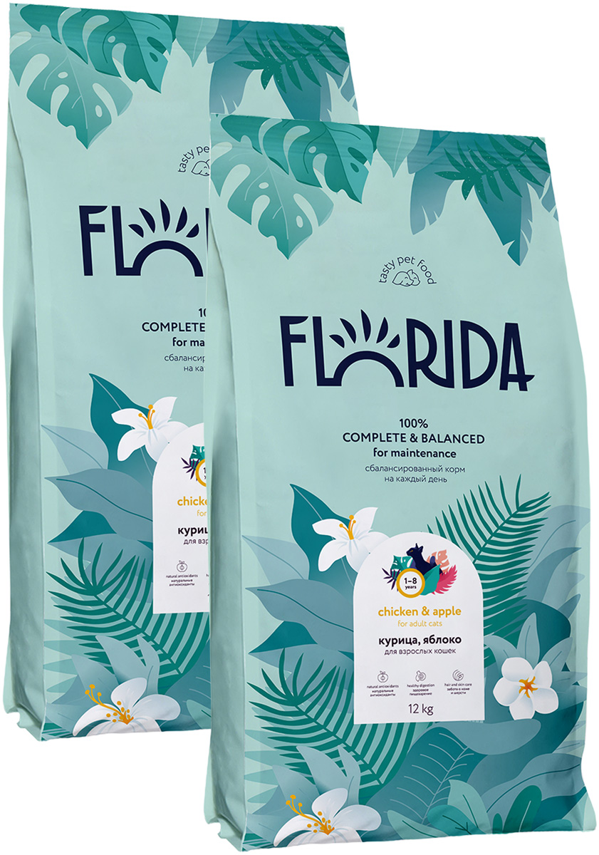 Сухой корм для кошек FLORIDA курица, яблоко (12 + 12 кг)