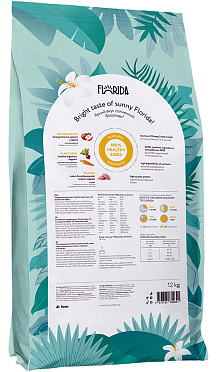 Сбалансированное полнорационное питание заботится о коже и шерсти и способствует здоровому пищеварению.В рационе кормов FLORIDA используется только белок животного происхождения.