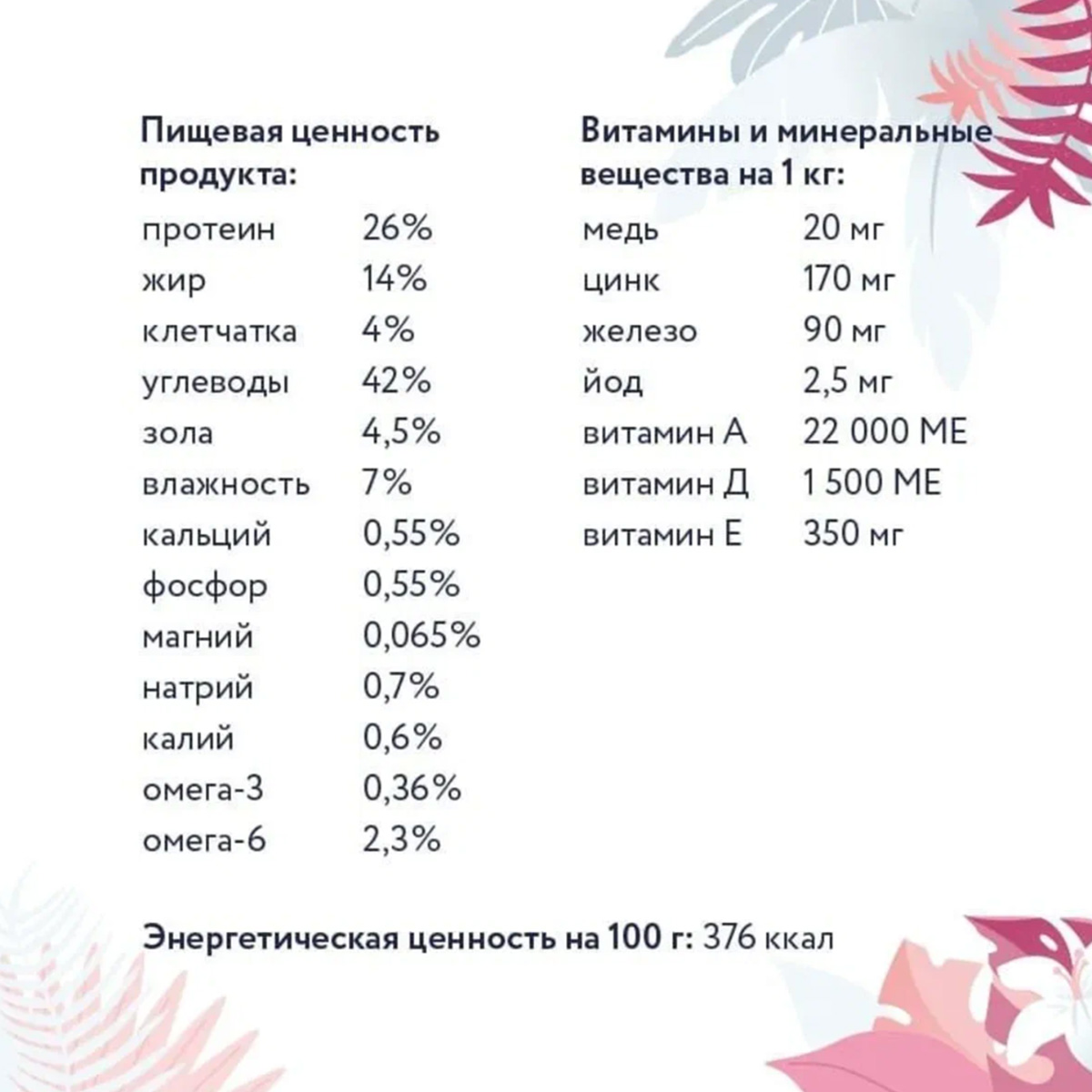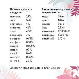 Пищевые добавки (на 1 кг): Медь – 20 мг, Цинк – 170 мг, Железо – 90 мг, Йод – 2,5 мг, Витамин А – 22000 МЕ, Витамин Д - 1500 МЕ, Витамин Д – 1500 МЕ, Витамин Е – 350 мг,