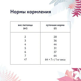 Рекомендации по кормлению: Переход с предыдущего рациона осуществлять постепенно, небольшими порциями в течение 5-7 дней. Рекомендации по кормлению могут варьироваться в зависимости от возраста, состояния, активности и условий содержания животного.