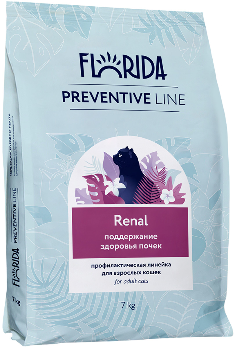 Полнорационный сбалансированный сухой корм для кошек Florida Preventive Line Renal предназначен для поддержания здоровой работы почек у взрослых кошек, а также для профилактики почечной недостаточности и ее осложнений.