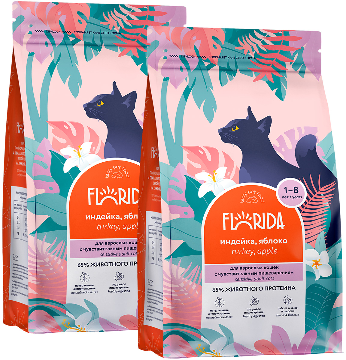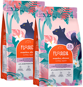 Сухой корм для кошек FLORIDA с чувствительным пищеварением индейка, яблоко (0,4 + 0,4 кг)