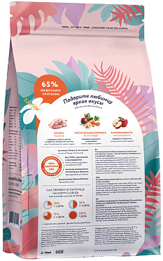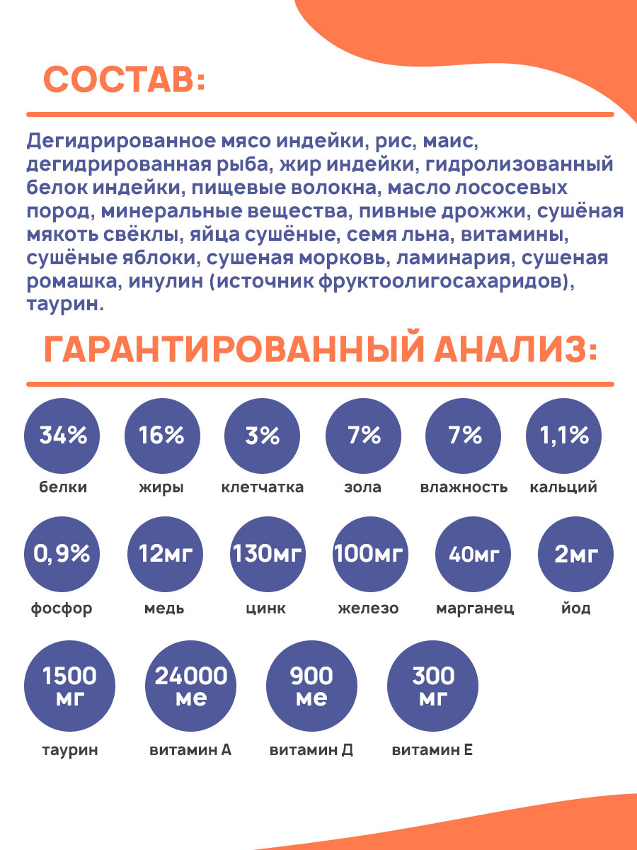 Дегидрированное мясо индейки, рис, маис, дегидрированная рыба, жир индейки, гидролизованный белок индейки, пищевые волокна, масло лососевых пород, минеральные вещества, пивные дрожжи, сушёная мякоть свёклы, яйца сушёные, семя льна, витамины, сушёные яблоки, сушеная морковь, ламинария, сушеная ромашка, инулин (источник фруктоолигосахаридов), таурин.