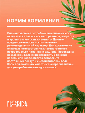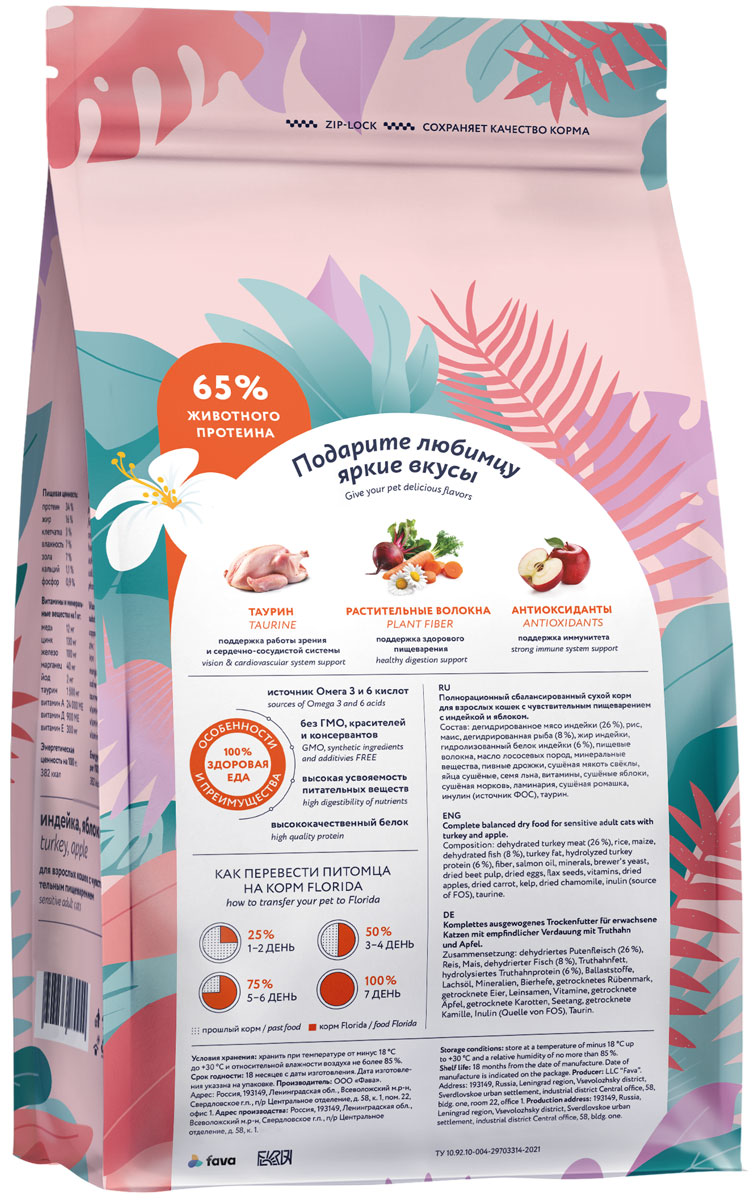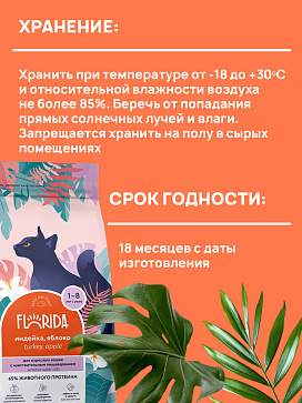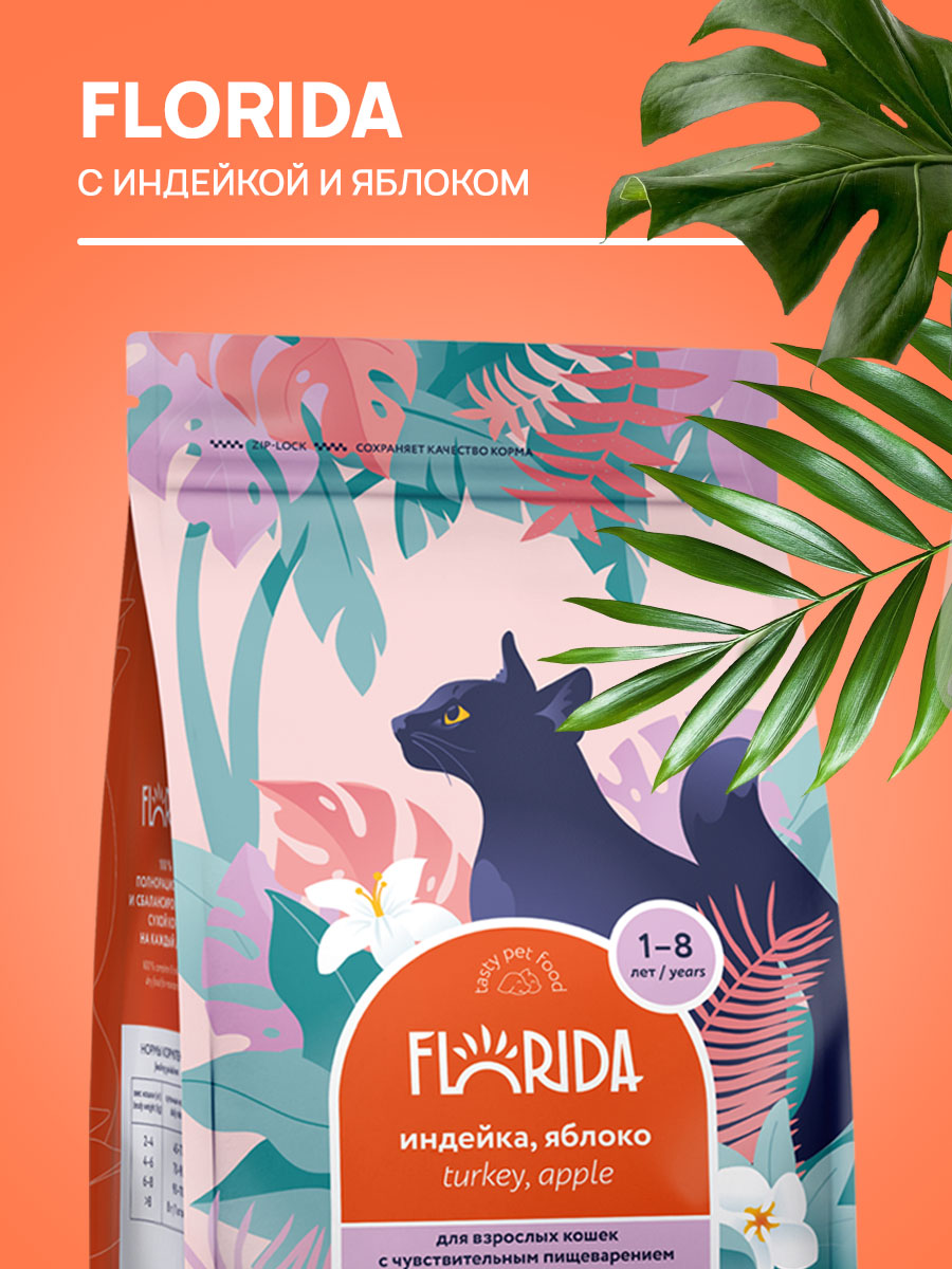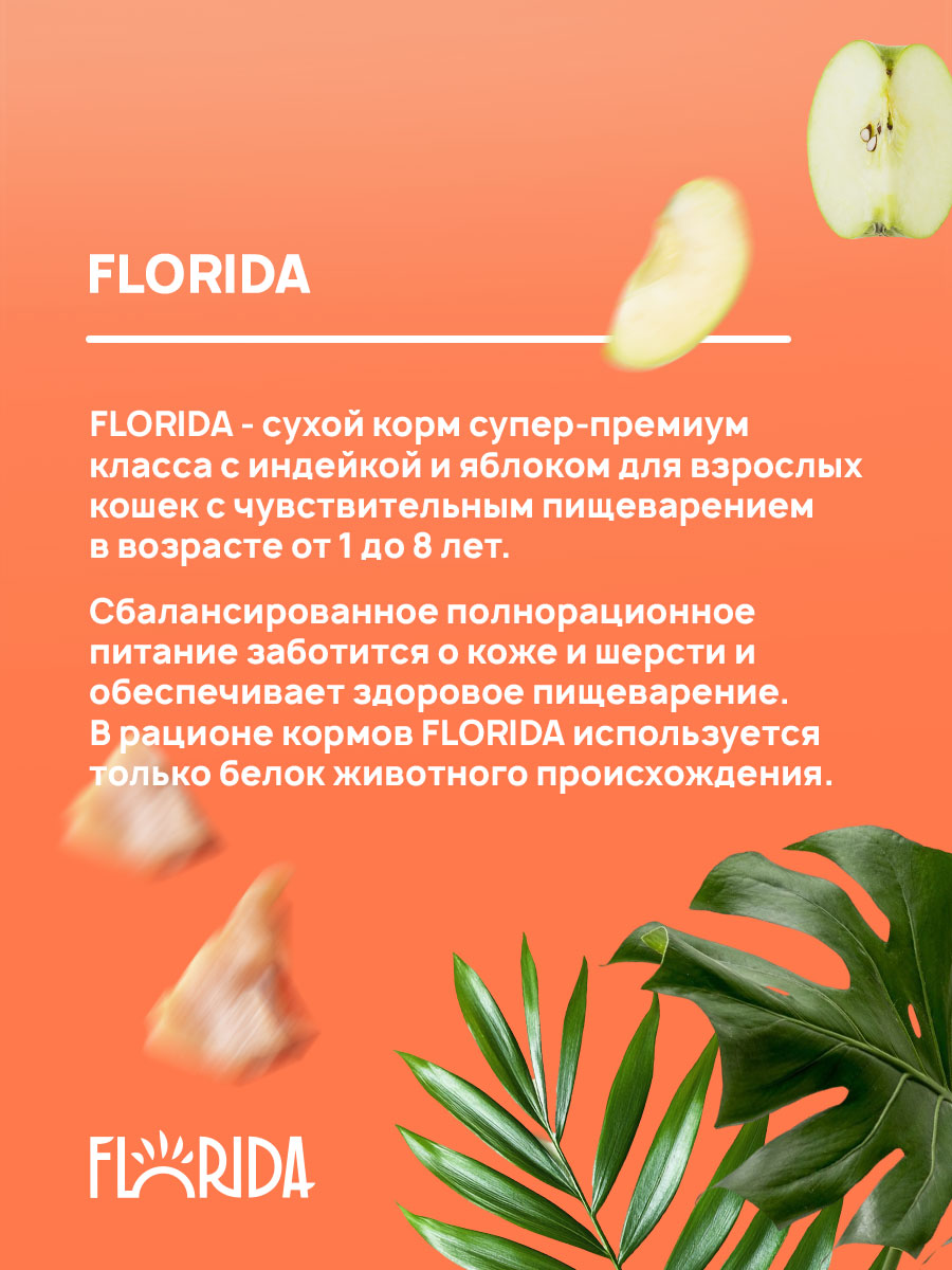 FLORIDA - сухой корм супер-премиум класса с индейкой и яблоком для взрослых кошек с чувствительным пищеварением в возрасте от 1 до 8 лет. Сбалансированное полнорационное питание заботится о коже и шерсти и обеспечивает здоровое пищеварение. В рационе кормов FLORIDA используется только белок животного происхождения.