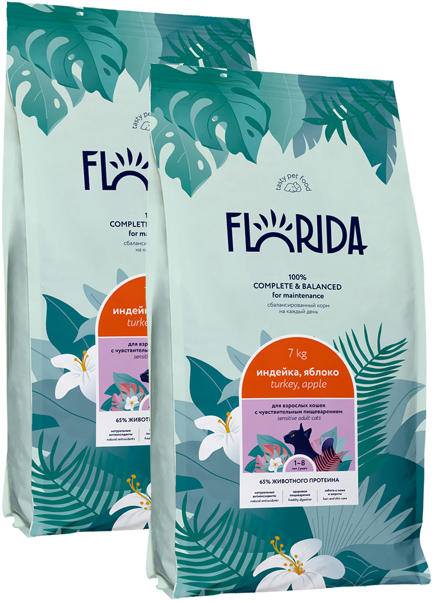 Сухой корм для кошек FLORIDA с чувствительным пищеварением индейка, яблоко (7 + 7 кг)