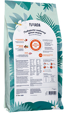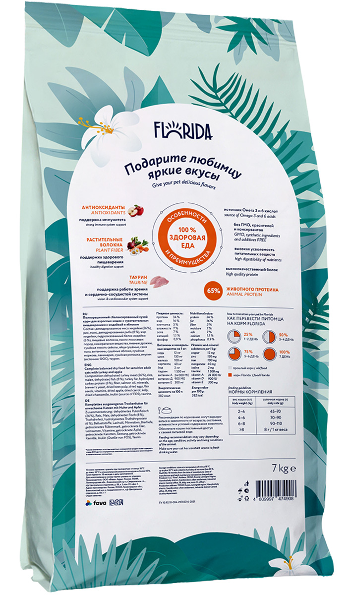 FLORIDA - сухой корм супер-премиум класса с индейкой и яблоком для взрослых кошек с чувствительным пищеварением в возрасте от 1 до 8 лет. Сбалансированное полнорационное питание заботится о коже и шерсти и обеспечивает здоровое пищеварение. В рационе кормов FLORIDA используется только белок животного происхождения.