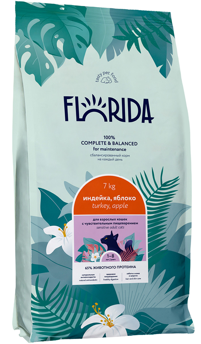 Сухой корм для кошек FLORIDA с чувствительным пищеварением индейка, яблоко (7 кг)