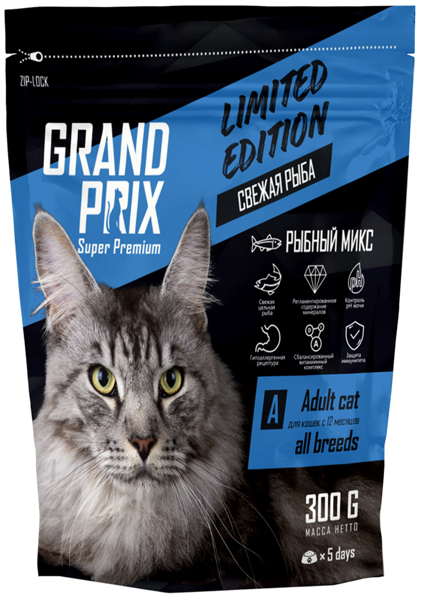 Grand Prix 6 Mix Fish – полнорационный сбалансированный корм для взрослых кошек всех пород.