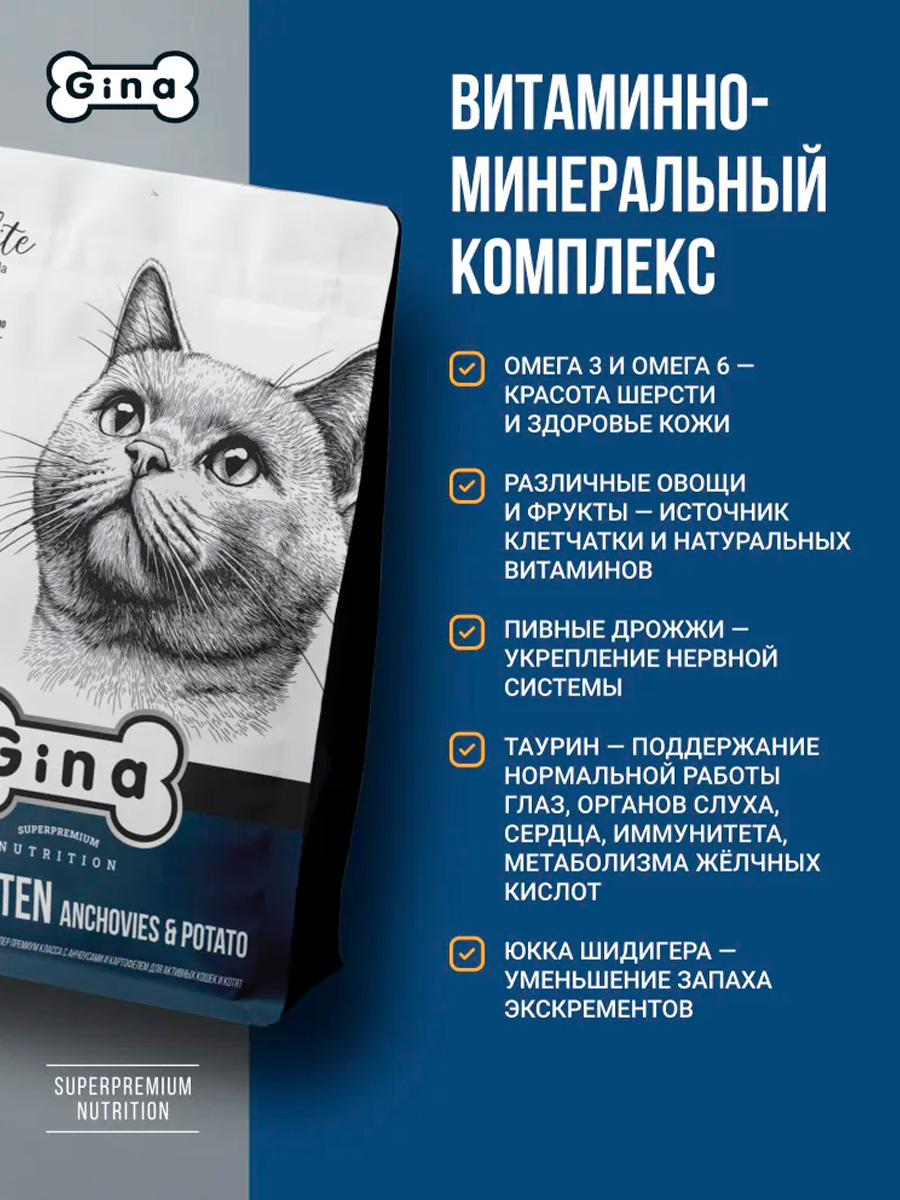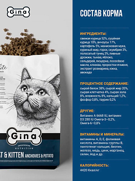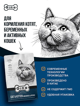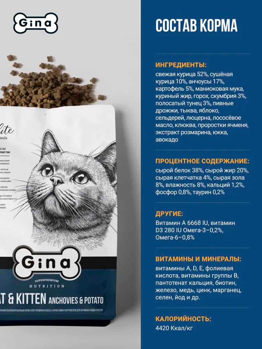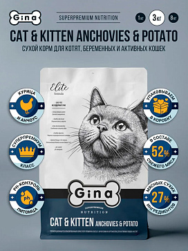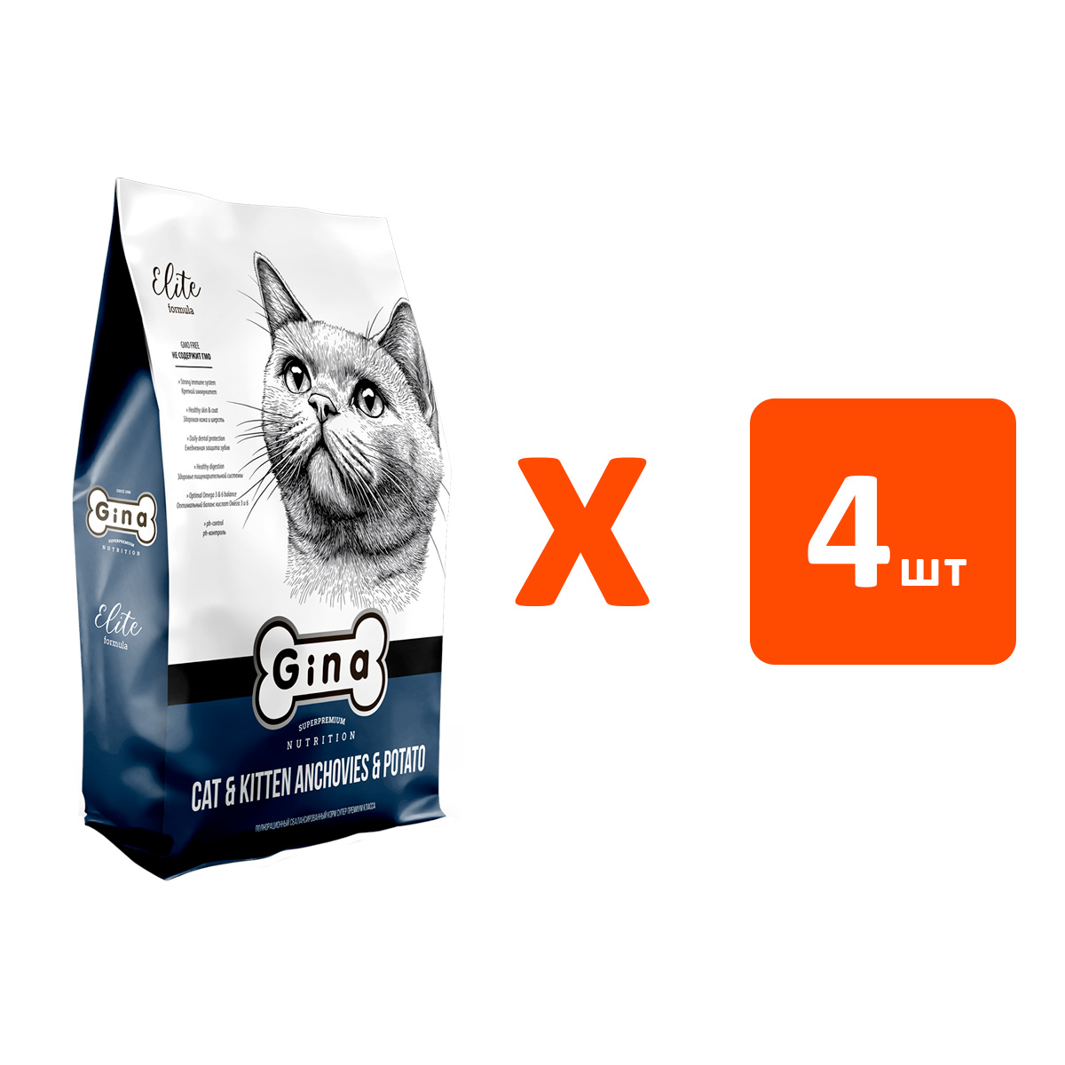 Сухой корм для кошек и котят GINA ELITE CAT & KITTEN анчоусы, картофель (3 кг х 4 шт)
