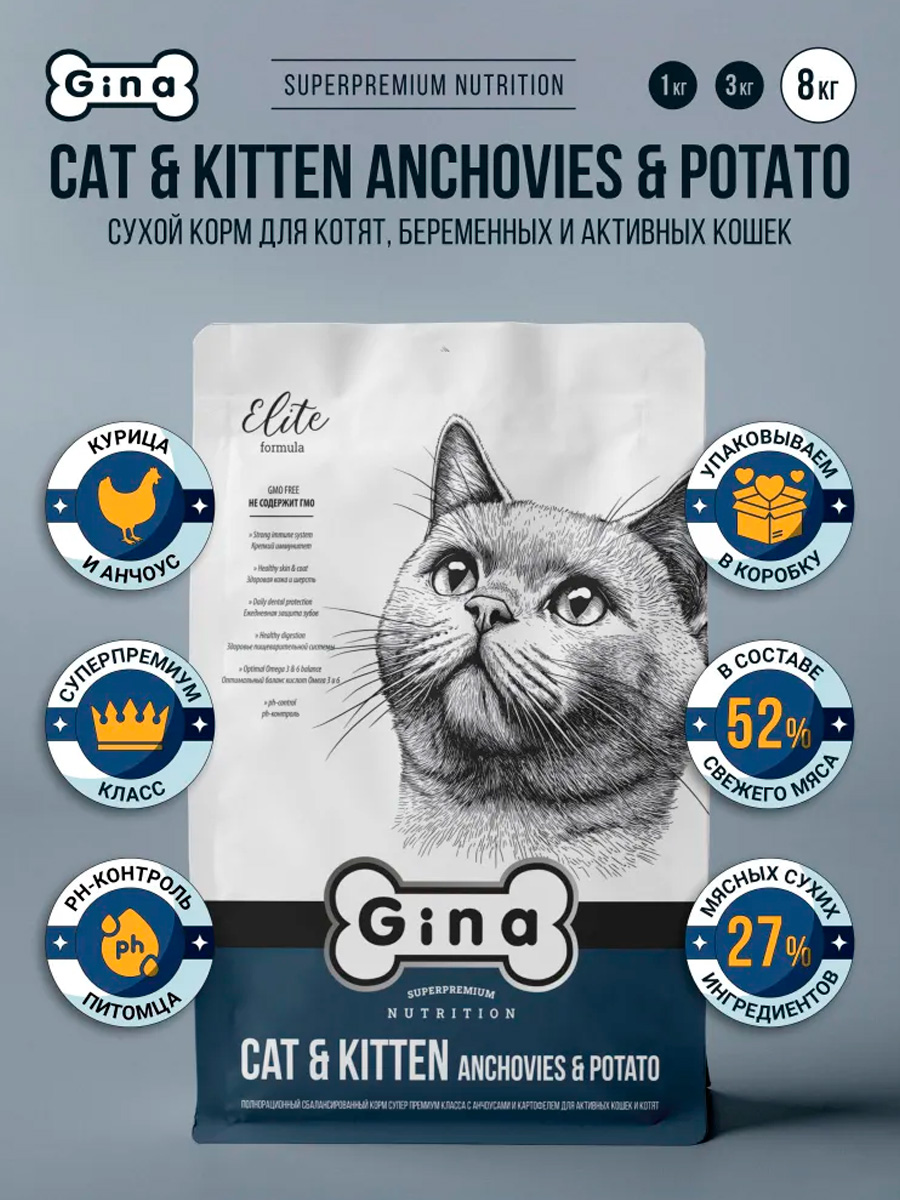Сухой корм для кошек и котят GINA ELITE CAT & KITTEN анчоусы, картофель (8 + 8 кг)
