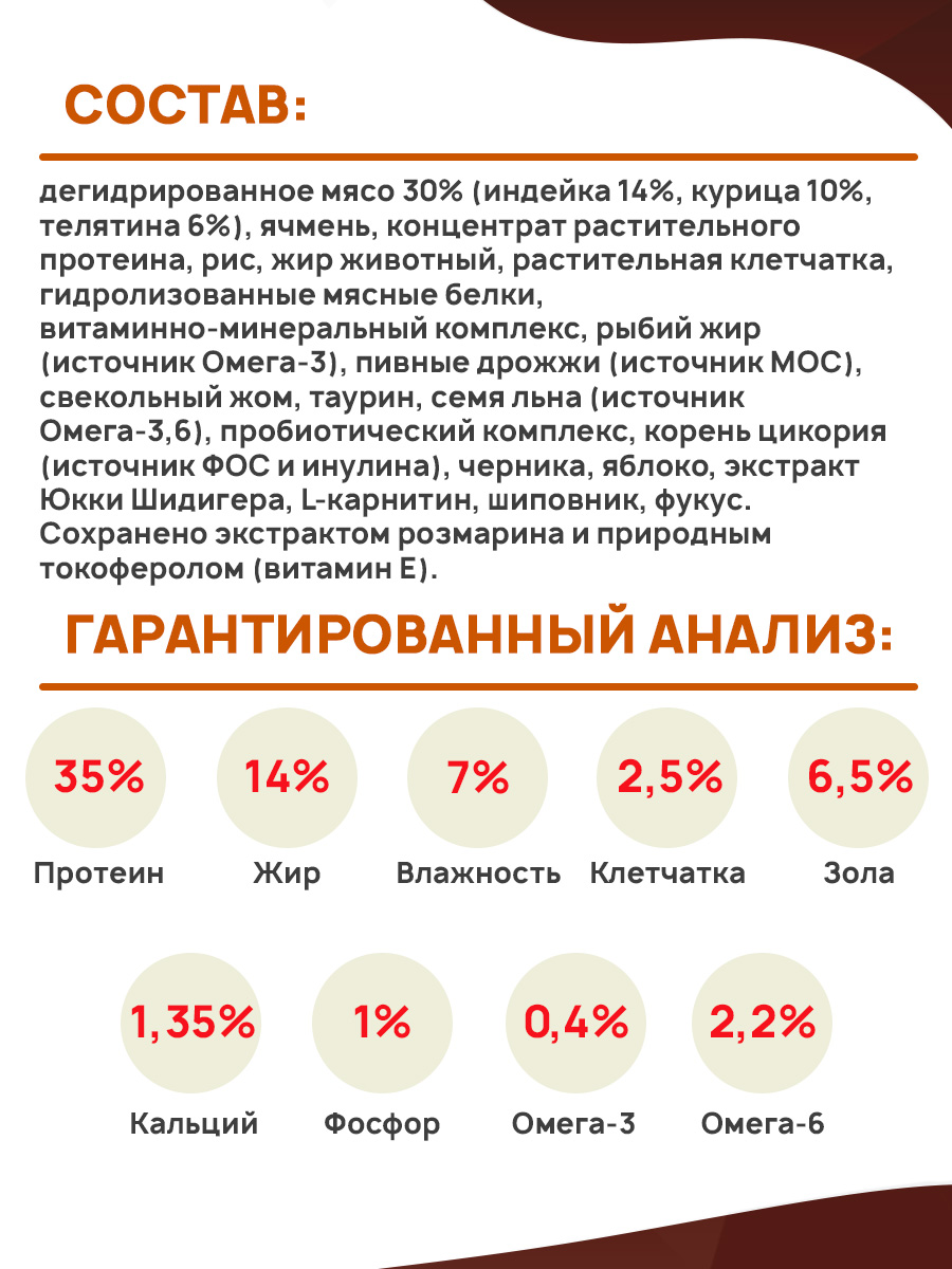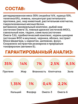 Состав: дегидрированное мясо 30% (индейка 14%, курица 10%, телятина 6%), ячмень, концентрат растительного протеина, рис, жир животный, растительная клетчатка, гидролизованные мясные белки, витаминно-минеральный комплекс, рыбий жир (источник Омега-3), пивные дрожжи (источник МОС), свекольный жом, таурин, семя льна (источник Омега-3,6), пробиотический комплекс, корень цикория (источник ФОС и инулина), черника, яблоко, экстракт Юкки Шидигера, L-карнитин, шиповник, фукус. Сохранено экстрактом розмарина и природным токоферолом (витамин Е).