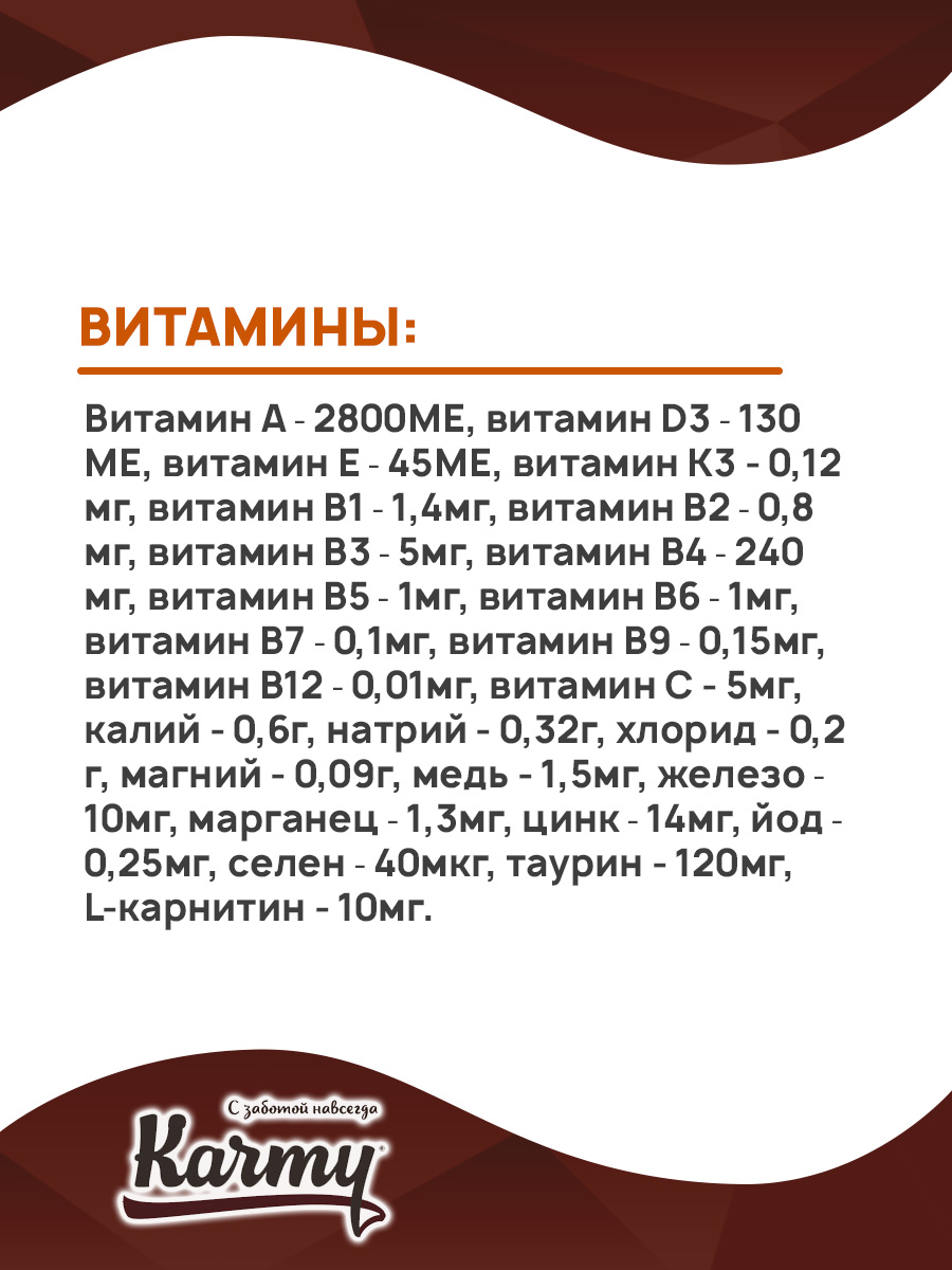 Витамин А ⎼ 2800МЕ, витамин D3 ⎼ 130МЕ, витамин Е ⎼ 45МЕ, витамин K3 - 0,12мг, витамин В1 ⎼ 1,4мг, витамин В2 ⎼ 0,8мг, витамин В3 ⎼ 5мг, витамин В4 ⎼ 240мг, витамин В5 ⎼ 1мг, витамин В6 ⎼ 1мг, витамин В7 ⎼ 0,1мг, витамин В9 ⎼ 0,15мг, витамин В12 ⎼ 0,01мг, витамин С - 5мг, калий - 0,6г, натрий - 0,32г, хлорид - 0,2г, магний - 0,09г, медь - 1,5мг, железо ⎼ 10мг, марганец ⎼ 1,3мг, цинк ⎼ 14мг, йод ⎼ 0,25мг, селен ⎼ 40мкг, таурин - 120мг, L-карнитин - 10мг.