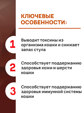 - Способствует поддержанию здоровья кожи и шерсти кошки