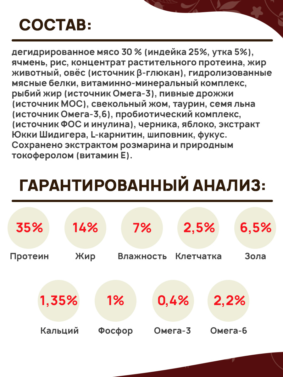 Состав: дегидрированное мясо 30 % (индейка 25%, утка 5%), ячмень, рис, концентрат растительного протеина, жир животный, овёс (источник β-глюкан), гидролизованные мясные белки, витаминно-минеральный комплекс, рыбий жир (источник Омега-3), пивные дрожжи (источник МОС), свекольный жом, таурин, семя льна (источник Омега-3,6), пробиотический комплекс, (источник ФОС и инулина), черника, яблоко, экстракт Юкки Шидигера, L-карнитин, шиповник, фукус. Сохранено экстрактом розмарина и природным токоферолом (витамин Е).
