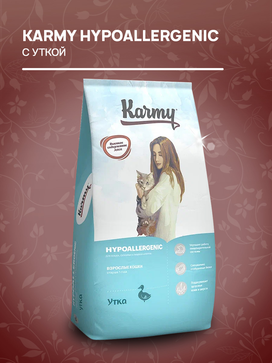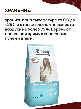 Полнорационный сухой корм KARMY HYPOALLERGENIC с уткой предназначен для взрослых кошек старше 1 года, склонных к пищевой аллергии. В зависимости от предпочтений вашей кошки корм можно давать сухим или увлажнённым.