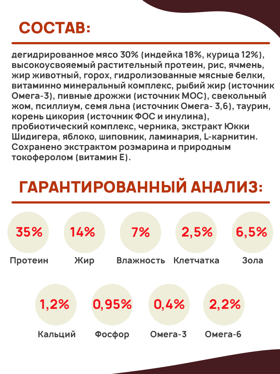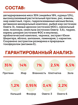 Состав: дегидрированное мясо 30% (индейка 18%, курица 12%), высокоусвояемый растительный протеин, рис, ячмень, жир животный, горох, гидролизованные мясные белки, витаминно минеральный комплекс, рыбий жир (источник Омега-3), пивные дрожжи (источник МОС), свекольный жом, псиллиум, семя льна (источник Омега- 3,6), таурин, корень цикория (источник ФОС и инулина), пробиотический комплекс, черника, экстракт Юкки Шидигера, яблоко, шиповник, ламинария, L-карнитин. Сохранено экстрактом розмарина и природным токоферолом (витамин Е).