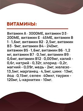 Витамин А ⎼ 3000МЕ, витамин D3 ⎼ 200МЕ, витамин Е ⎼ 45МЕ, витамин В1 ⎼ 1,6мг, витамин В2 ⎼ 2,5мг, витамин В3 ⎼ 9мг, витамин В4 ⎼ 240мг, витамин В5 ⎼ 1,6мг, витамин В6 ⎼ 1,2мг, витамин В7 ⎼ 0,1мг, витамин В9 ⎼ 0,6мг, витамин В12 ⎼ 0,009мг, калий - 0,6г, натрий - 0,32г, хлорид - 0,2г, магний - 0,09г, медь - 2мг, железо ⎼ 13,5мг, марганец ⎼ 4,5мг, цинк ⎼ 13мг, йод ⎼ 0,15мг, селен ⎼ 40мкг, таурин - 120мг, L-карнитин - 10мг.