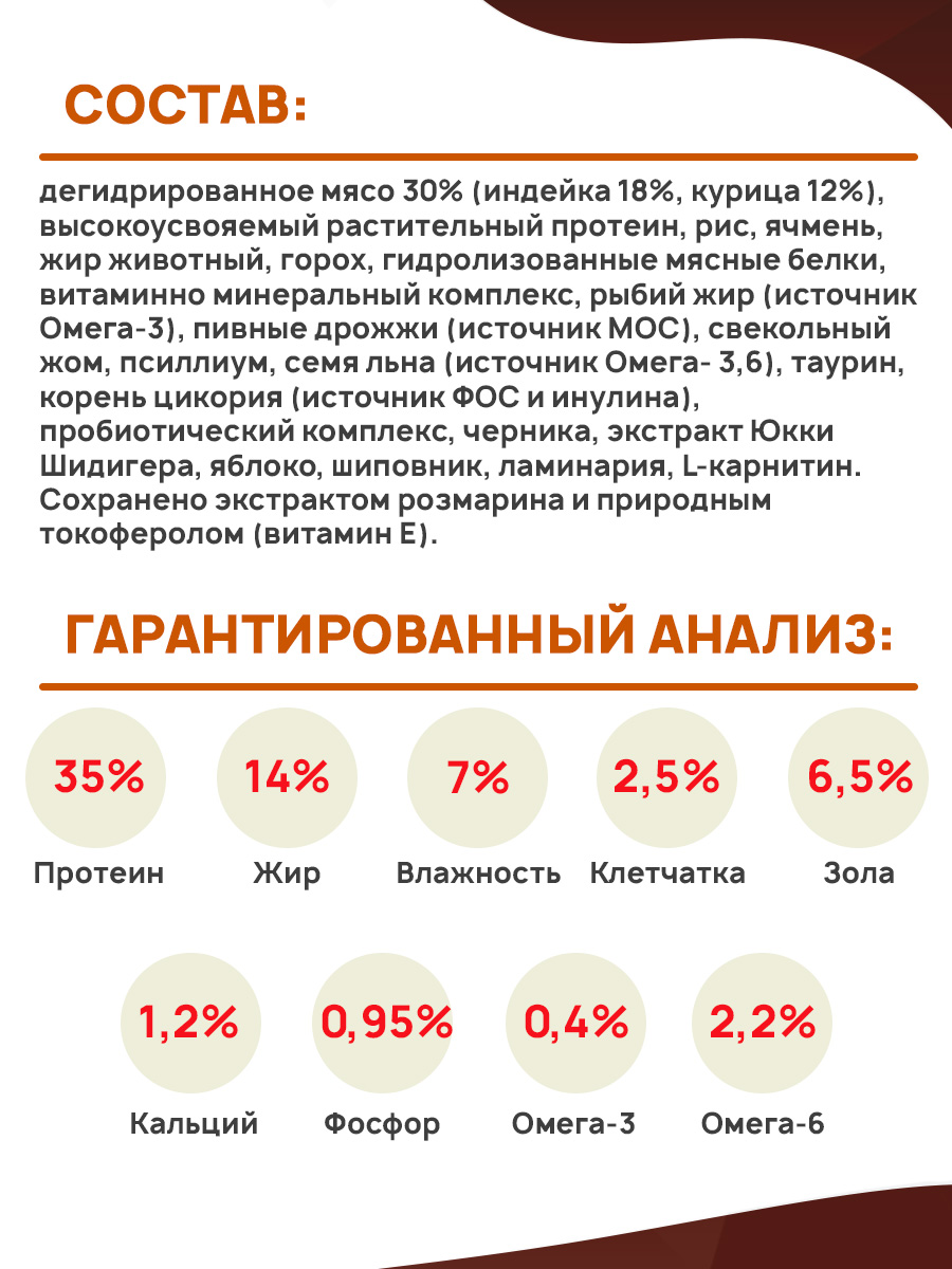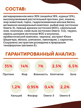 Состав: дегидрированное мясо 30% (индейка 18%, курица 12%), высокоусвояемый растительный протеин, рис, ячмень, жир животный, горох, гидролизованные мясные белки, витаминно минеральный комплекс, рыбий жир (источник Омега-3), пивные дрожжи (источник МОС), свекольный жом, псиллиум, семя льна (источник Омега- 3,6), таурин, корень цикория (источник ФОС и инулина), пробиотический комплекс, черника, экстракт Юкки Шидигера, яблоко, шиповник, ламинария, L-карнитин. Сохранено экстрактом розмарина и природным токоферолом (витамин Е).