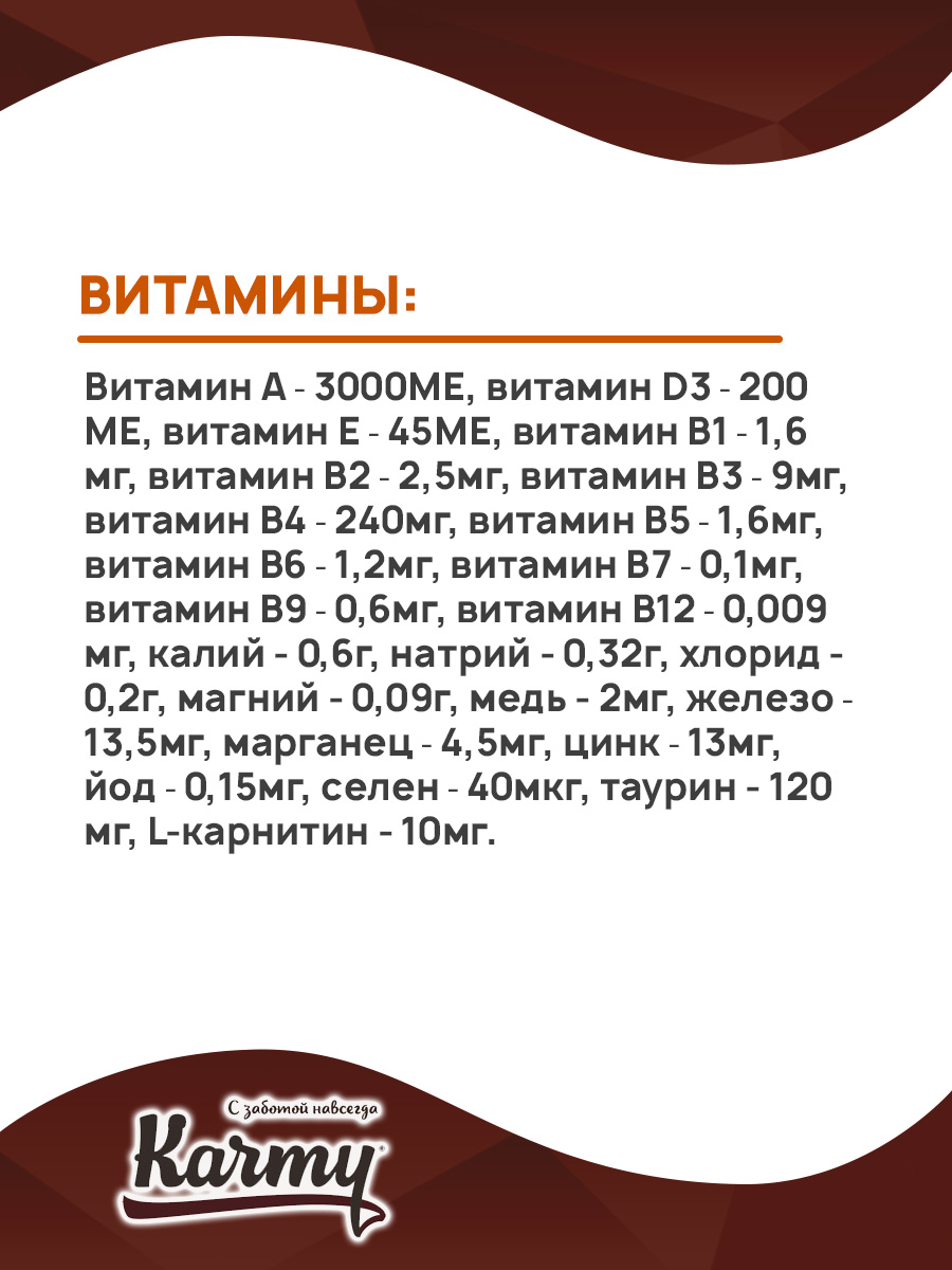 Витамин А ⎼ 3000МЕ, витамин D3 ⎼ 200МЕ, витамин Е ⎼ 45МЕ, витамин В1 ⎼ 1,6мг, витамин В2 ⎼ 2,5мг, витамин В3 ⎼ 9мг, витамин В4 ⎼ 240мг, витамин В5 ⎼ 1,6мг, витамин В6 ⎼ 1,2мг, витамин В7 ⎼ 0,1мг, витамин В9 ⎼ 0,6мг, витамин В12 ⎼ 0,009мг, калий - 0,6г, натрий - 0,32г, хлорид - 0,2г, магний - 0,09г, медь - 2мг, железо ⎼ 13,5мг, марганец ⎼ 4,5мг, цинк ⎼ 13мг, йод ⎼ 0,15мг, селен ⎼ 40мкг, таурин - 120мг, L-карнитин - 10мг.