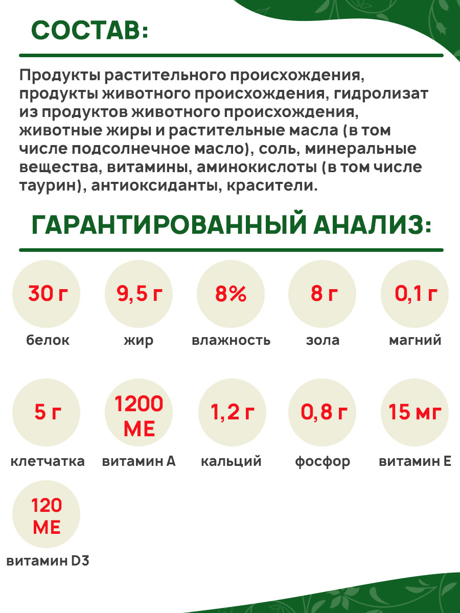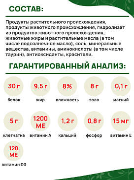 Продукты растительного происхождения, продукты животного происхождения, гидролизат из продуктов животного происхождения, животные жиры и растительные масла (в том числе подсолнечное масло), соль, минеральные вещества, витамины, аминокислоты (в том числе таурин), антиоксиданты, красители.