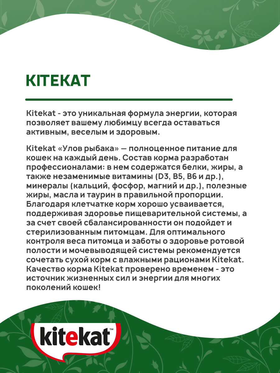 Kitekat «Улов рыбака» — полноценное питание для кошек на каждый день. Состав корма разработан профессионалами: в нем содержатся белки, жиры, а также незаменимые витамины (D3, B5, B6 и др.), минералы (кальций, фосфор, магний и др.), полезные жиры, масла и таурин в правильной пропорции. Благодаря клетчатке корм хорошо усваивается, поддерживая здоровье пищеварительной системы, а за счет своей сбалансированности он подойдет и стерилизованным питомцам. Для оптимального контроля веса питомца и заботы о здоровье ротовой полости и мочевыводящей системы рекомендуется сочетать сухой корм с влажными рационами Kitekat. Качество корма Kitekat проверено временем - это источник жизненных сил и энергии для многих поколений кошек!