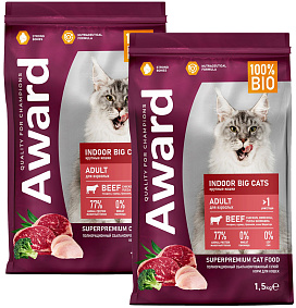 Сухой корм для кошек крупных пород AWARD INDOOR BIG CATS живущих дома говядина, курица (1,5 + 1,5 кг)