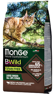 Сухой корм для кошек крупных пород MONGE BWILD GRAIN FREE LARGE BREED беззерновой буйвол, картофель (1,5 кг)