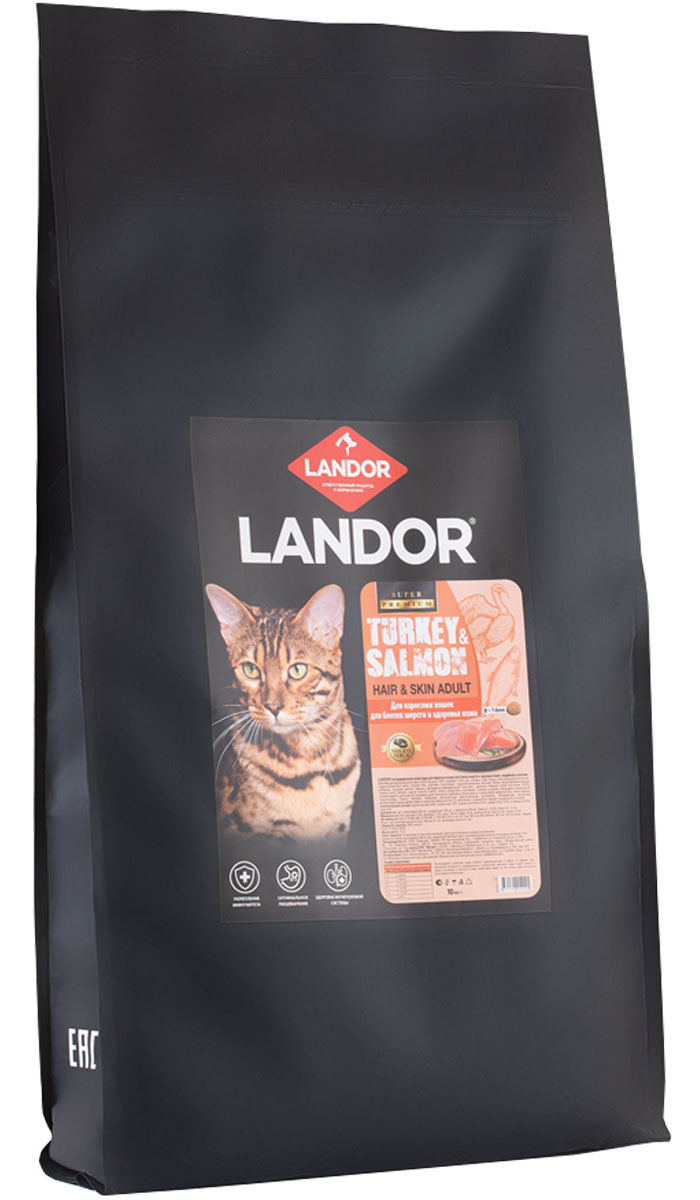 Сухой корм для кошек LANDOR ADULT HAIR & SKIN с чувствительной кожей и шерстью индейка, лосось (10 кг)