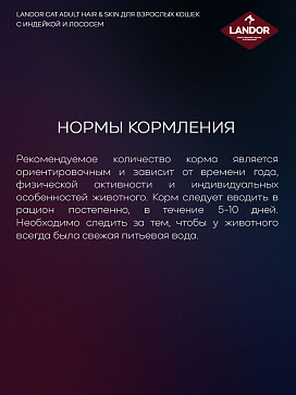 Сухой корм LANDOR CAT ADULT HAIR & SKIN разработан специально для взрослых кошек для здоровья кожи и красоты шерсти.