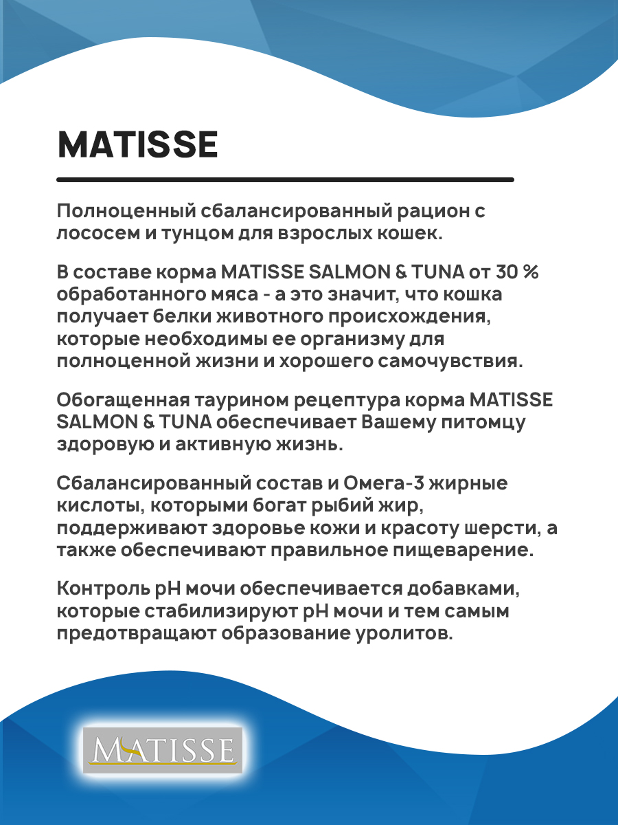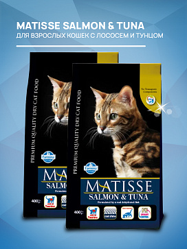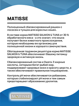 Обогащенная таурином рецептура корма MATISSE SALMON & TUNA обеспечивает Вашему питомцу здоровую и активную жизнь.