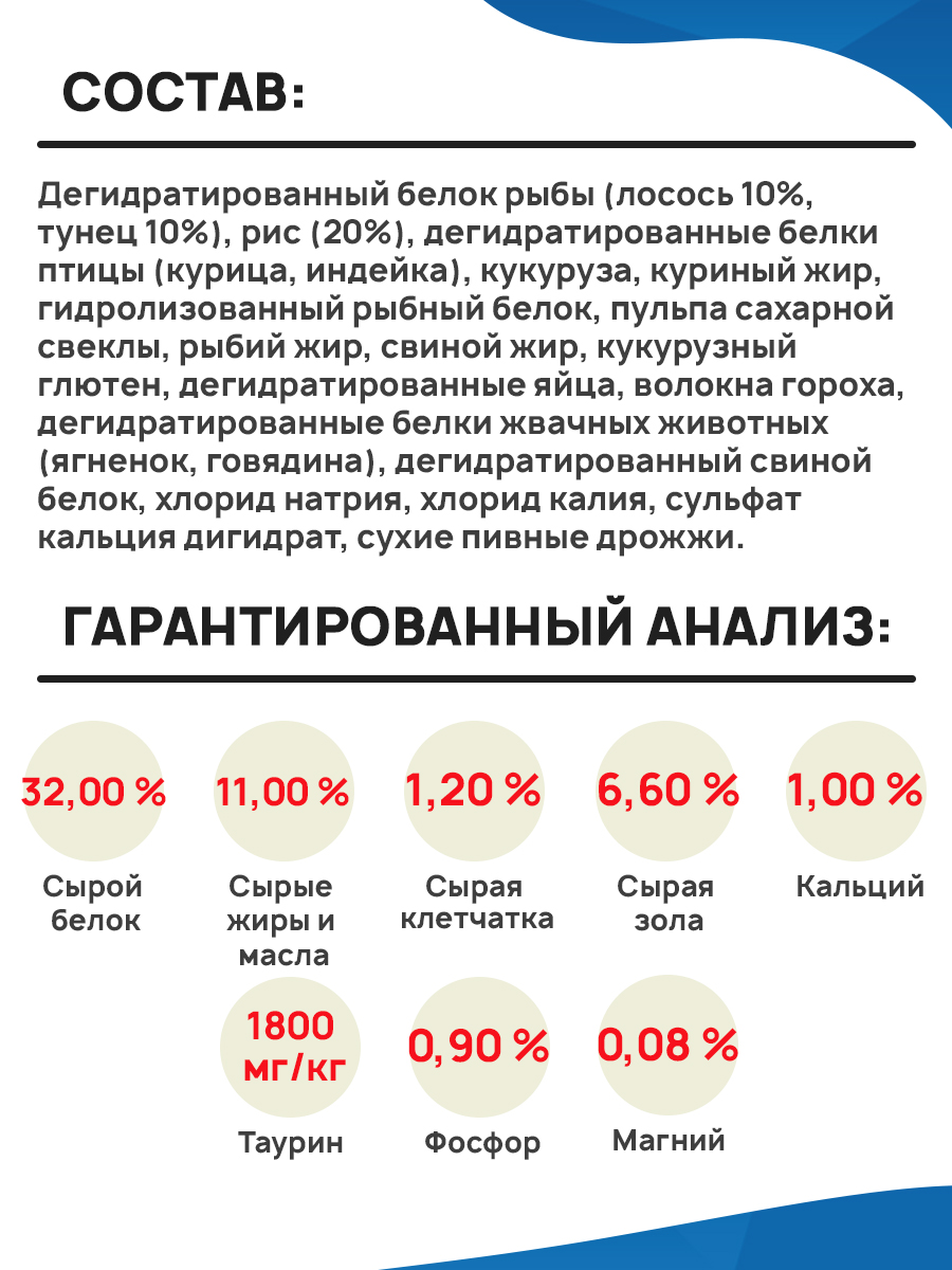 Дегидратированный белок рыбы (лосось 10%, тунец 10%), рис (20%), дегидратированные белки птицы (курица, индейка), кукуруза, куриный жир, гидролизованный рыбный белок, пульпа сахарной свеклы, рыбий жир, свиной жир, кукурузный глютен, дегидратированные яйца, волокна гороха, дегидратированные белки жвачных животных (ягненок, говядина), дегидратированный свиной белок, хлорид натрия, хлорид калия, сульфат кальция дигидрат, сухие пивные дрожжи.