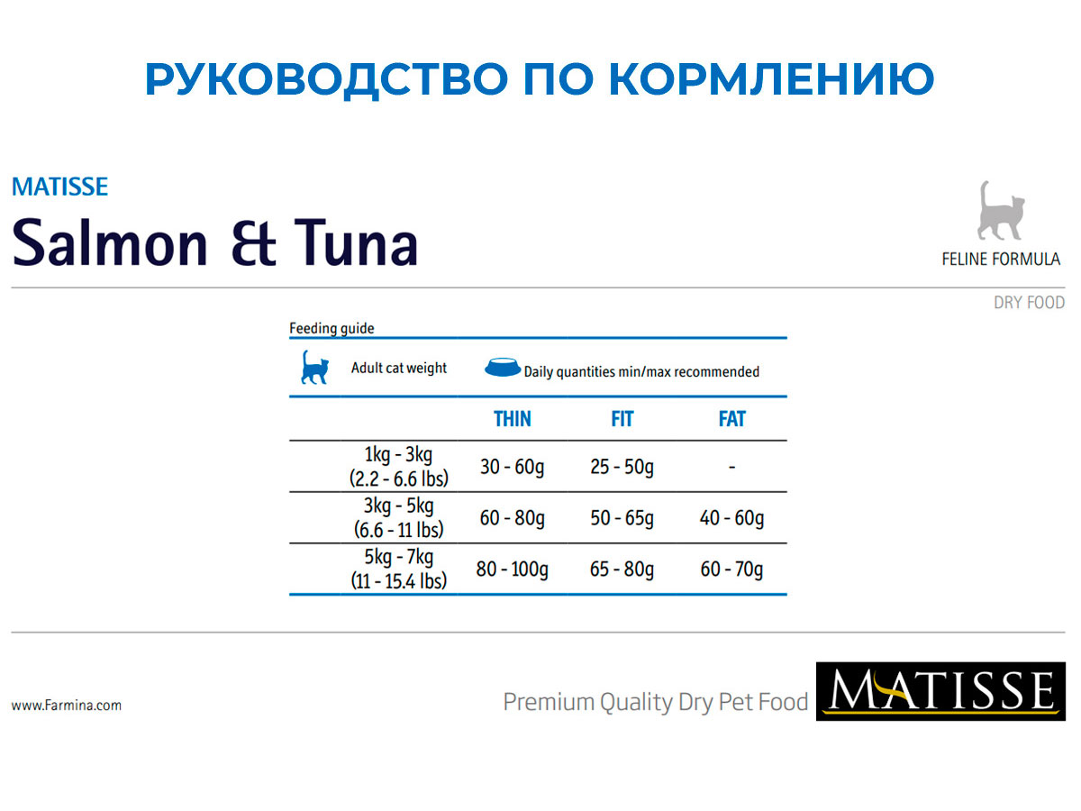 Обогащенная таурином рецептура корма MATISSE SALMON & TUNA обеспечивает Вашему питомцу здоровую и активную жизнь.