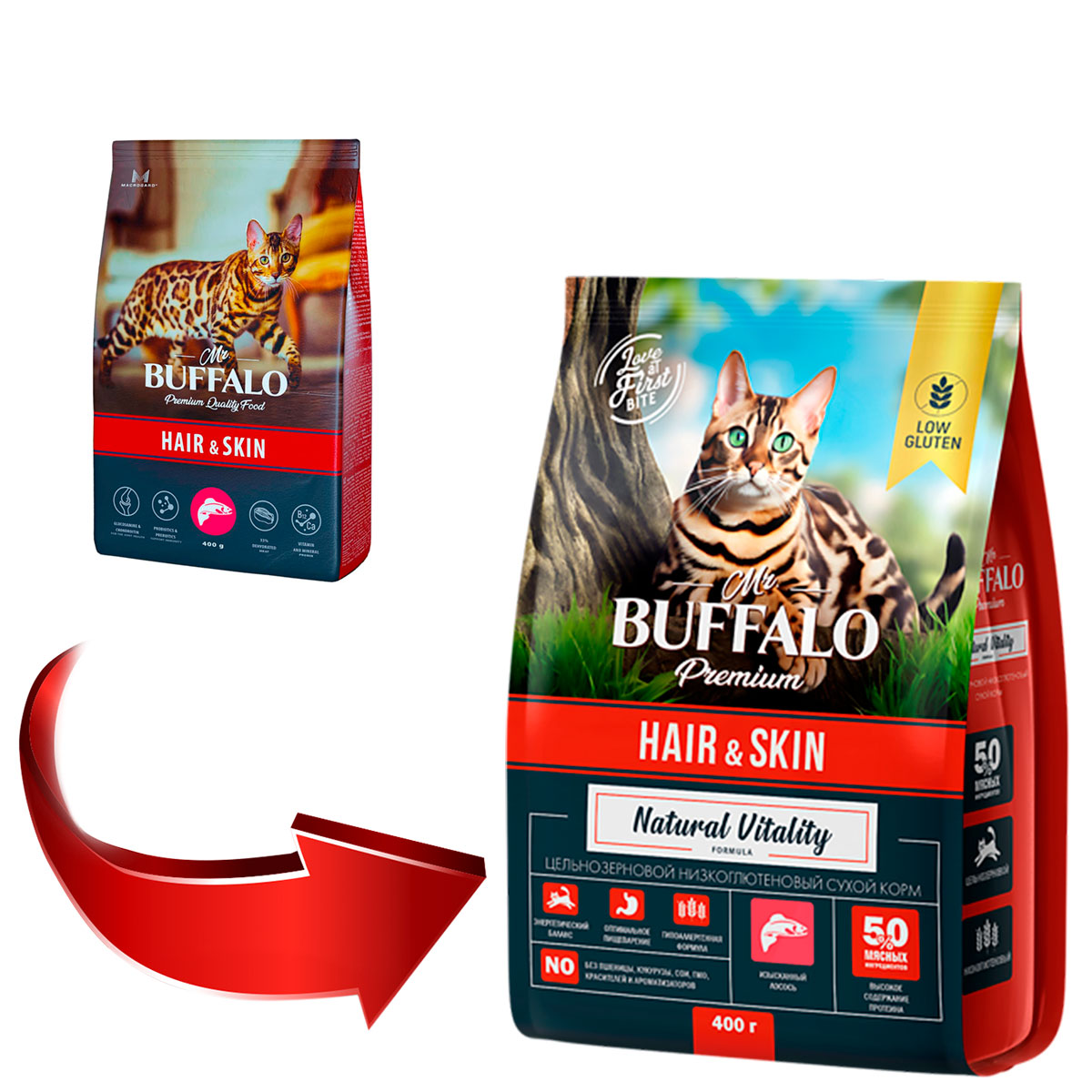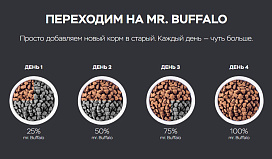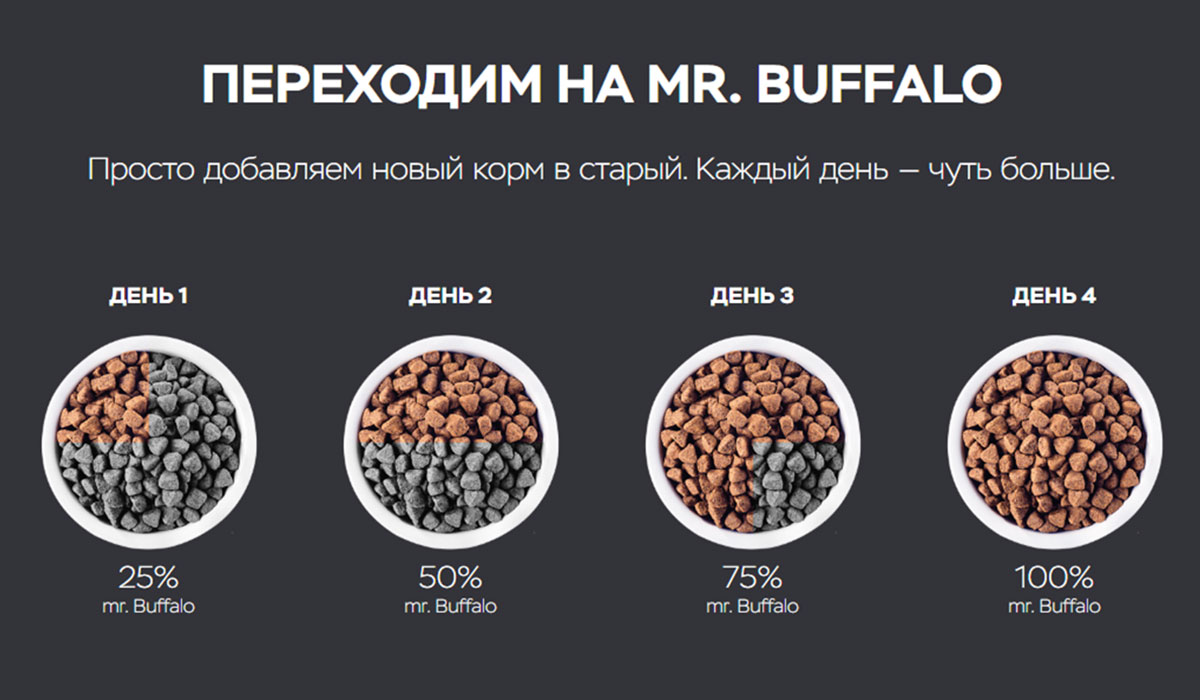 Mr.Buffalo — сбалансированный корм, созданный с учётом особенностей и потребностей Ваших питомцев. Чтобы обеспечить вашего любимца качественным питанием, мы включили в него животный белок, качественные жиры и использовали передовые технологии на сегодняшний день.
