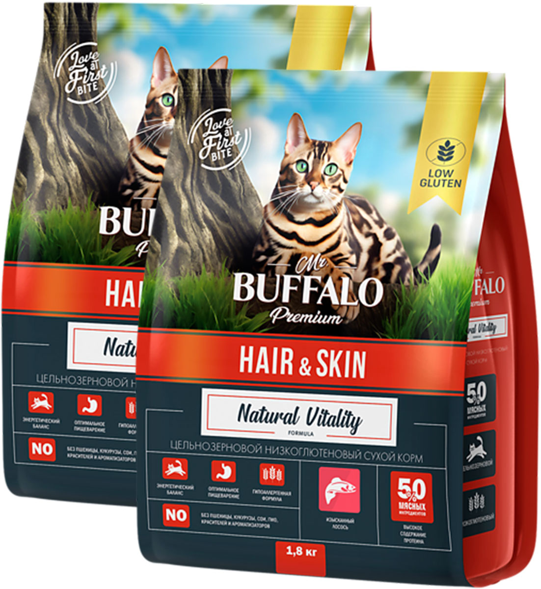 Сухой корм для кошек MR.BUFFALO ADULT HAIR & SKIN с чувствительной кожей и шерстью лосось (1,8 + 1,8 кг)