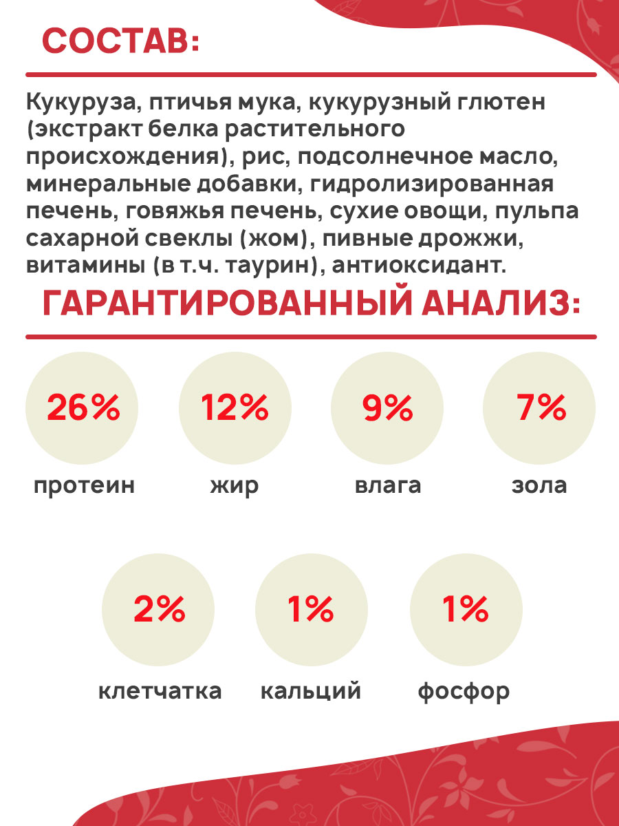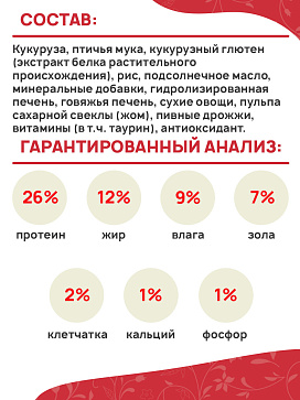 Кукуруза, птичья мука, кукурузный глютен (экстракт белка растительного происхождения), рис, подсолнечное масло, минеральные добавки, гидролизированная печень, говяжья печень, сухие овощи, пульпа сахарной свеклы (жом), пивные дрожжи, витамины (в т.ч. таурин), антиоксидант.