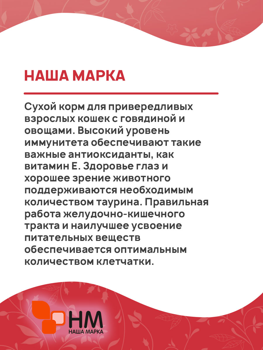 Сухой корм для привередливых взрослых кошек с говядиной и овощами.