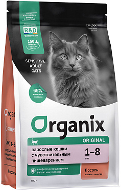 Сухой корм для кошек ORGANIX ADULT с чувствительным пищеварением лосось, фрукты, овощи (0,4 кг)