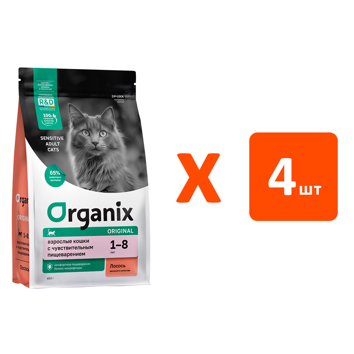 Сухой корм для кошек ORGANIX ADULT с чувствительным пищеварением лосось, фрукты, овощи (0,4 кг х 4 шт)