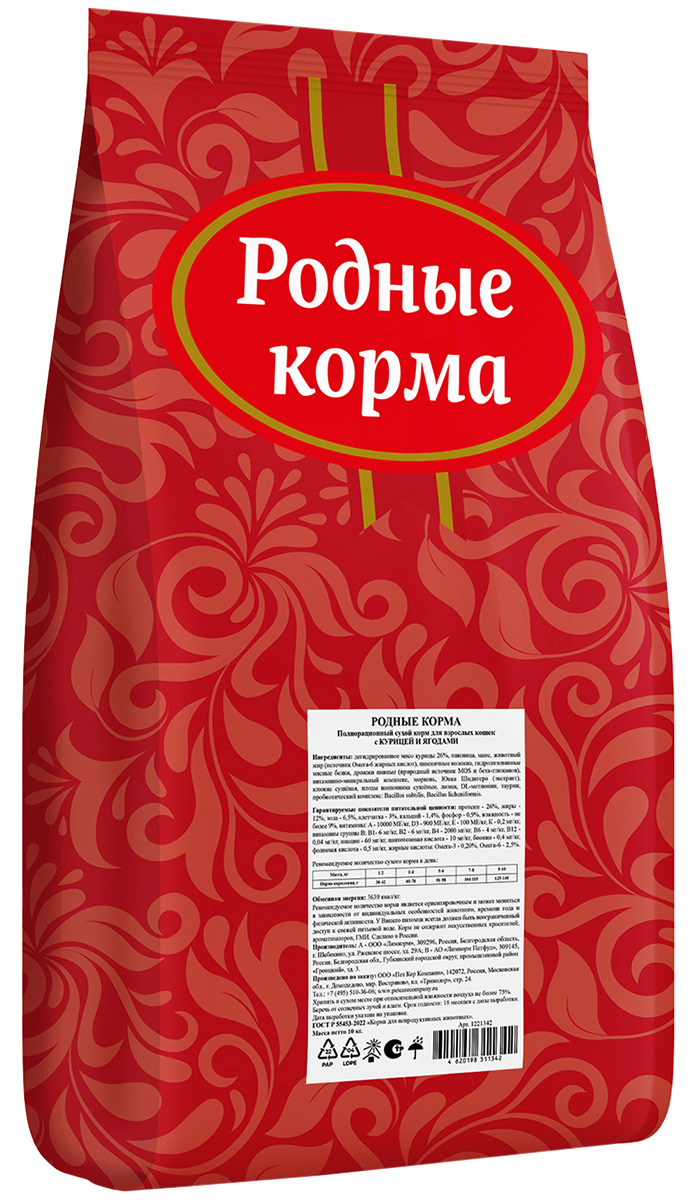 Особенностью корма «Сухой полнорационный корм РОДНЫЕ КОРМА для взрослых кошек с курицей и ягодами» является наличие в составе ягод, богатых антиоксидантами, которые способствуют укреплению иммунитета и поддержанию здоровья кожи и шерсти кошки. Курица — источник легкоусвояемого белка, который обеспечивает энергией и способствует правильному развитию мышечной массы.
