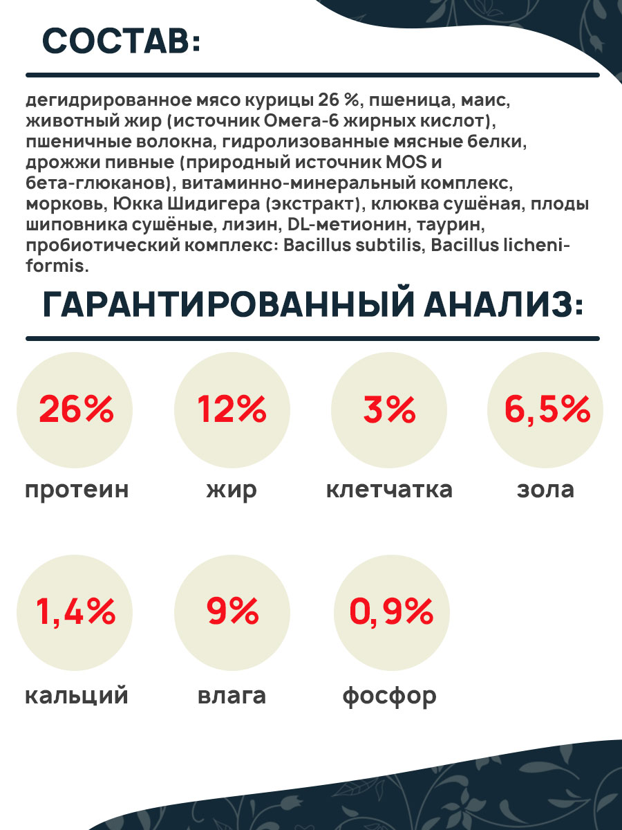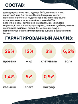 Состав: дегидрированное мясо курицы 26 %, пшеница, маис, животный жир (источник Омега-6 жирных кислот), пшеничные волокна, гидролизованные мясные белки, дрожжи пивные (природный источник MOS и бета-глюканов), витаминно-минеральный комплекс, морковь, Юкка Шидигера (экстракт), клюква сушёная, плоды шиповника сушёные, лизин, DL-метионин, таурин, пробиотический комплекс: Bacillus subtilis, Bacillus licheniformis.