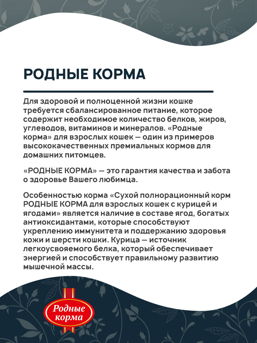 Особенностью корма «Сухой полнорационный корм РОДНЫЕ КОРМА для взрослых кошек с курицей и ягодами» является наличие в составе ягод, богатых антиоксидантами, которые способствуют укреплению иммунитета и поддержанию здоровья кожи и шерсти кошки. Курица — источник легкоусвояемого белка, который обеспечивает энергией и способствует правильному развитию мышечной массы.