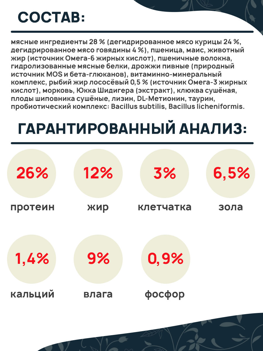 Состав: мясные ингредиенты 28 % (дегидрированное мясо курицы 24 %, дегидрированное мясо говядины 4 %), пшеница, маис, животный жир (источник Омега-6 жирных кислот), пшеничные волокна, гидролизованные мясные белки, дрожжи пивные (природный источник MOS и бета-глюканов), витаминно-минеральный комплекс, рыбий жир лососёвый 0,5 % (источник Омега-3 жирных кислот), морковь, Юкка Шидигера (экстракт), клюква сушёная, плоды шиповника сушёные, лизин, DL-Метионин, таурин, пробиотический комплекс: Bacillus subtilis, Bacillus licheniformis.