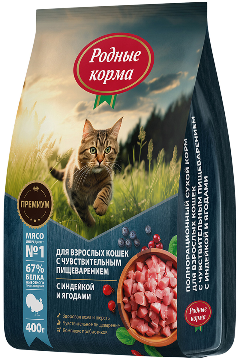 Сухой корм для кошек РОДНЫЕ КОРМА с чувствительным пищеварением индейка, ягоды (0,4 кг)
