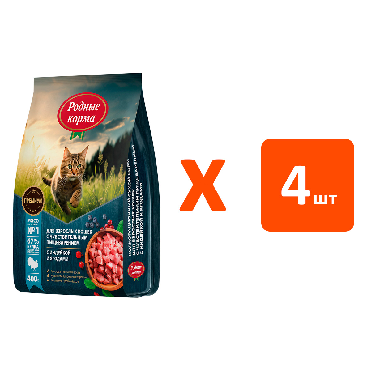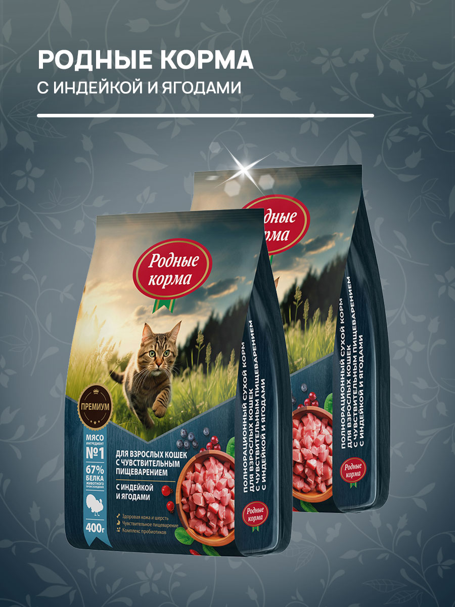 Сухой корм для кошек РОДНЫЕ КОРМА с чувствительным пищеварением индейка, ягоды (0,4 кг х 4 шт)