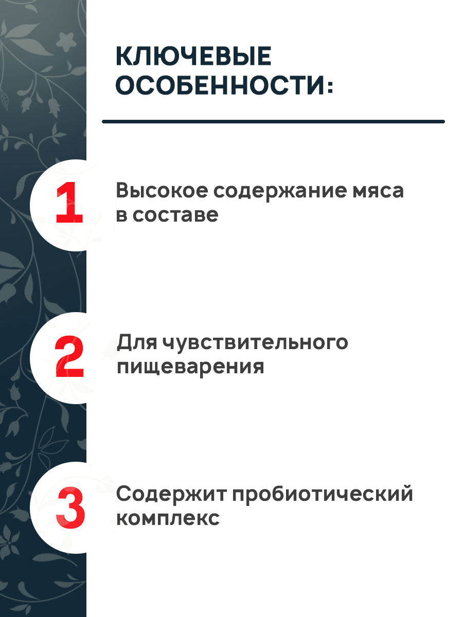 - Высокое содержание мяса в составе.